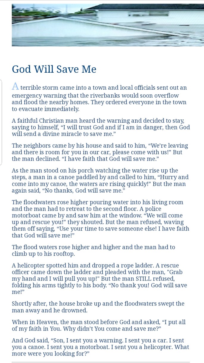 God sends help into our lives in so many forms, let us not be like this man and blind to it, forgetting how God uses each of us for His plan and Glory. I have no doubt we are being used as warnings, cars, boats and helicopters in the lives around us. Accept support and offer support, we don’t make it through this life alone.
